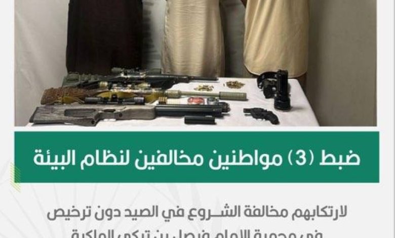 تمكنت القوات الخاصة للأمن البيئي وهي تؤدي مهامها في تنفيذ نظام البيئة من ضبط (3) مواطنين مخالفين لنظام البيئة لارتكابهم مخالفة الشروع في الصيد دون ترخيص في محمية الإمام فيصل بن تركي الملكية، بحوزتهم (3) بنادق هوائية و(740) ذخيرة منوعة، وطُبقت الإجراءات النظامية بحقهم.