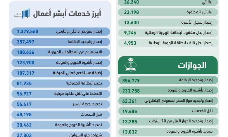 وعبر الخدمات العامة في منصة أبشر أفراد، تم إصدار 106,787 تقريرًا في خدمة تقارير أبشر، و19,025 طلبًا لتوصيل الوثائق بالبريد، و2,473 استفسارًا عامًا عن البصمة.