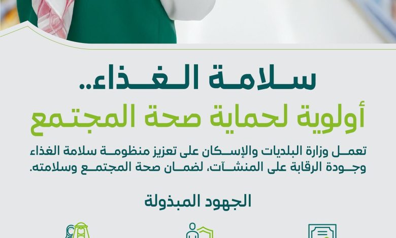 أكّدت وزارة البلديات والإسكان استمرار جهودها في تعزيز سلامة الغذاء ورفع كفاءة الرقابة الصحية على المنشآت الغذائية في مختلف مناطق المملكة، ضمن مساعيها لتحقيق أعلى معايير الصحة العامة وجودة الحياة، ودعم مستهدفات رؤية المملكة 2030م، في بناء مدن صحية ومستدامة، وذلك تزامنًا مع يوم الغذاء العالمي الذي يصادف السادس عشر من أكتوبر من كل عام.
