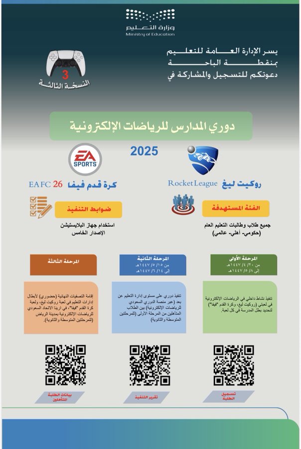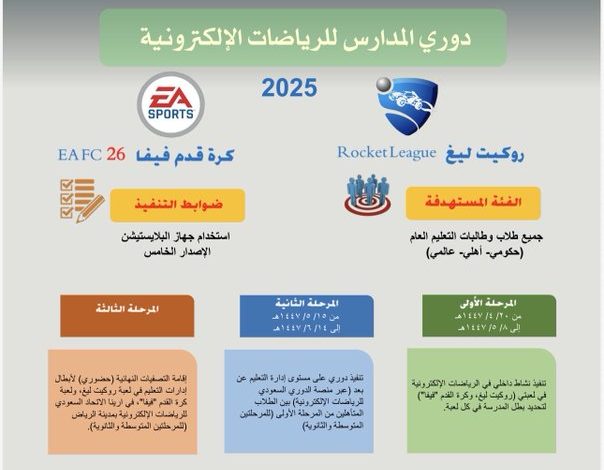 وأوضح تعليم الباحة أن البطولة تستهدف طلاب وطالبات المراحل الدراسية المختلفة في منافسات لعبتي “روكيت ليغ” و”كرة القدم EAFC 26″، مشيرًا إلى أن المسابقة تأتي امتدادًا لجهود وزارة التعليم في دعم الأنشطة اللاصفية، وتنمية مهارات الطلبة التقنية والرقمية، وتعزيز روح التنافس الإيجابي والإبداع في المجالات الحديثة المرتبطة بصناعة الألعاب الإلكترونية.