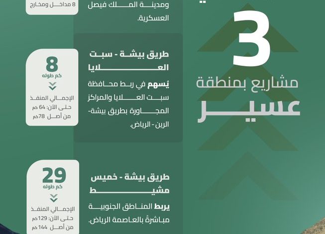 ويأتي المشروع الثاني استكمالًا للمرحلة الخامسة للطريق الرابط بين محافظتي بيشة وخميس مشيط، بطول 29 كلم، ليصل إجمالي ما تم تنفيذه حتى الآن إلى 129 كلم من أصل 144 كلم، فيما يهدف المشروع إلى ربط المناطق الجنوبية مباشرةً بالعاصمة الرياض، مما يعزز كفاءة شبكة النقل ويدعم التنمية الاقتصادية.
