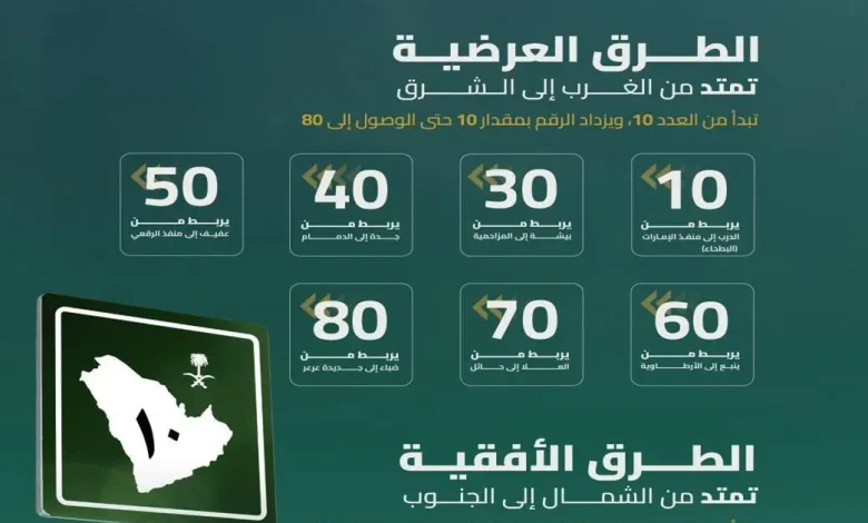 أوضحت الهيئة العامة للطرق نظام ترقيم الطرق في المملكة العربية السعودية، مشيرة إلى أنه يعتمد على تصنيف يُقسم الطرق إلى رئيسية وثانوية وفرعية، كما يسهم في تخطيط الطرق وتحديد أنواعها، مع تعزيز الربط بين المدن لضمان سلامة مستخدميها وتوفير تجربة قيادة متميزة.