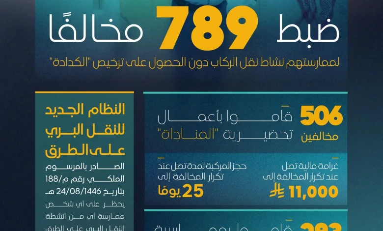 وكشفت الهيئة أن الفرق الرقابية ضبطت (506) مخالفين قاموا بالأعمال التحضيرية “المناداة” لنقل الركاب باستخدام سياراتهم الخاصة دون ترخيص، و(283) مخالفًا نقلوا الركاب على متن سياراتهم الخاصة بطرق غير نظامية.