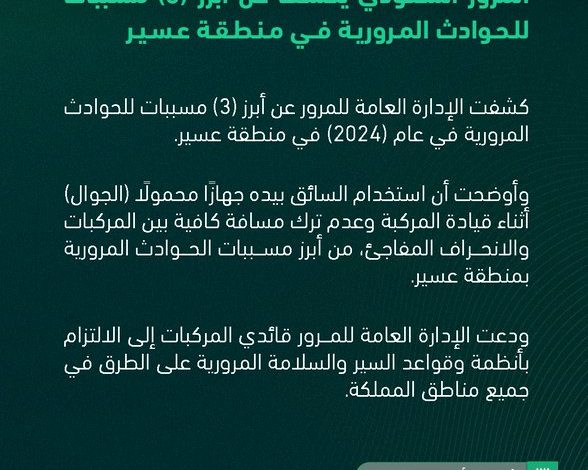 “المرور السعودي” يكشف عن أبرز (3) مسببات للحوادث المرورية في منطقة عسير