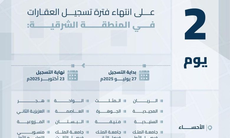 أعلنت الهيئة العامة للعقار عن قرب انتهاء المهلة المحددة للتسجيل العيني الأول للعقار لـ 14878 قطعة عقارية في محافظة الأحساء بالمنطقة الشرقية بنهاية يوم الخميس 1 جمادى الأول 1447هــ، الموافق 23 أكتوبر 2025م.