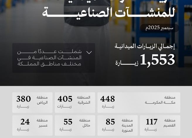 وأوضح المتحدث الرسمي لوزارة الصناعة والثروة المعدنية جراح الجراح، أنَّ الزيارات الميدانية المُنفَّذة خلال شهر سبتمبر 2025 شملت: 448 زيارة للمصانع في منطقة مكة المكرمة، و405 زيارات في المنطقة الشرقية، و380 زيارة في منطقة الرياض، إضافة إلى 117 زيارة في منطقة القصيم، و85 زيارة في منطقة المدينة المنورة، و55 زيارة في منطقة حائل، و24 زيارة في منطقة عسير، و20 زيارة في منطقة تبوك، و9 زيارات في منطقة الحدود الشمالية، و6 زيارات في منطقة جازان، و4 زيارات في منطقة نجران.