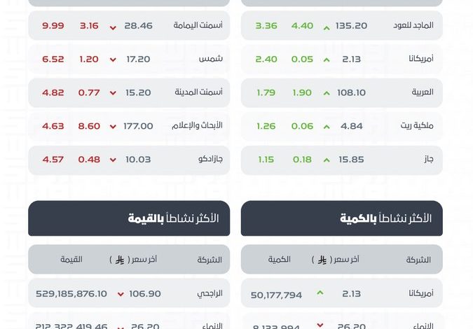 وكانت أسهم شركات الماجد للعود، وأمريكانا، والعربية، وملكية ريت، وجاز الأكثر ارتفاعًا، أما أسهم شركات أسمنت اليمامة، وشمس، وأسمنت المدينة، والأبحاث والإعلام، وجازادكو الأكثر انخفاضًا في التعاملات، وتراوحت نسب الارتفاع والانخفاض ما بين (3.36%) و(9.99%)، فيما كانت أسهم شركات أمريكانا، والإنماء، وأرامكو السعودية، والجزيرة، وباتك، هي الأكثر نشاطًا بالكمية، بينما كانت أسهم الراجحي، والإنماء، والأهلي، وأرامكو السعودية، وأسمنت اليمامة، هي الأكثر نشاطًا في القيمة.