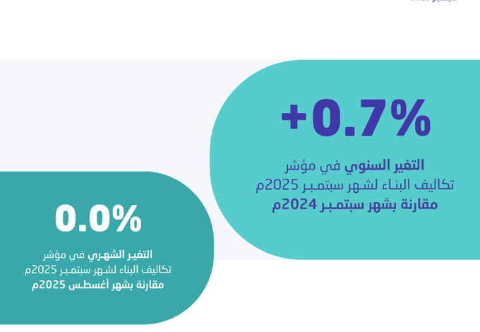 وفي ذات السياق أظهرت نتائج مسح الرقم القياسي لتكاليف البناء لشهر سبتمبر 2025م ارتفاعًا على أساس سنوي بنسبة 0.7% مقارنةً بالعام الماضي، متأثرًا بارتفاع تكاليف البناء للقطاع السكني بنسبة 0.8%، وللقطاع غير السكني بنسبة 0.6%.