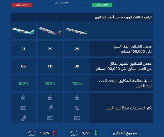 وأوضحت أن عدد شكاوى المسافرين على الناقلات الجوية بلغ (2399) شكوى، مبينةً أنَّ “طيران أديل” جاء أقلّ شركات الطيران شكاوى بواقع (38) شكوى لكل 100 ألف مسافر، وبنسبة معالجة للشكوى بالوقت المحدد لشهر سبتمبر إلى 98%، بينما حلَّ طيران ناس ثانيًا بواقع (43) شكوى لكل (100) ألف مسافر، وبنسبة معالجة للشكوى بالوقت المحدد إلى (100%)، وجاءت ثالثًا الخطوط الجوية السعودية، حيث وصل عدد الشكاوى إلى (54) شكوى لكل (100) ألف مسافر، وبنسبة معالجة للشكوى بالوقت المحدد إلى (90%)، وجاءت أكثر تصنيفات الشكاوى تداولًا لشهر سبتمبر عن الرحلات أولًا، ثم خدمات الأمتعة، ثم التذاكر.