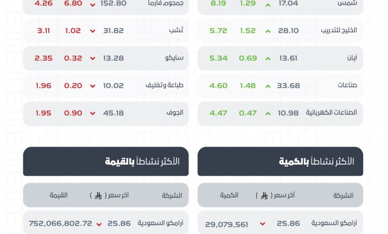 وكانت أسهم شركات شمس، والخليج للتدريب، وأيان، وصناعات، والصناعات الكهربائية الأكثر ارتفاعًا، أما أسهم شركات جمجوم فارما، وتشب، وسايكو، وطباعة وتغليف، والجوف الأكثر انخفاضًا في التعاملات، وتراوحت نسب الارتفاع والانخفاض ما بين (8.19%) و(4.26%)، فيما كانت أسهم شركات أرامكو السعودية، والكيميائية، وأمريكانا، والصناعات الكهربائية، والتصنيع، هي الأكثر نشاطًا بالكمية، بينما كانت أسهم أرامكو السعودية، والراجحي، والصناعات الكهربائية، والكيميائية، والإنماء، هي الأكثر نشاطًا في القيمة.