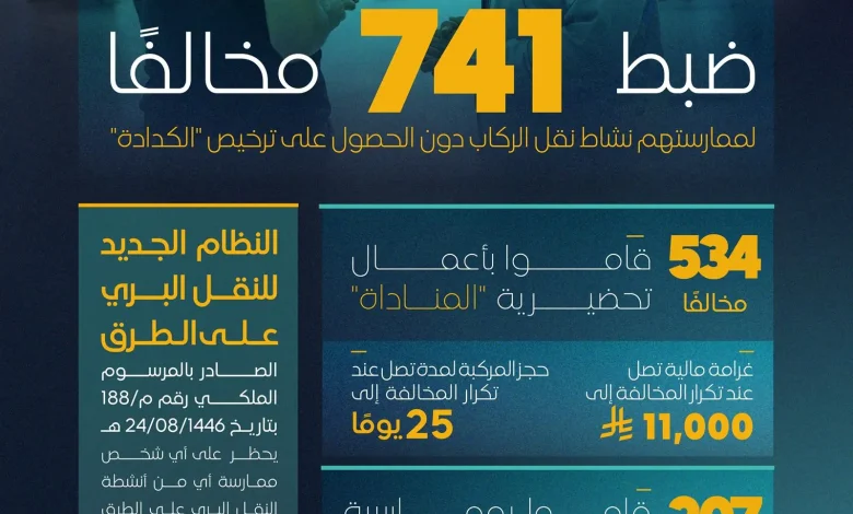 وكشفت الهيئة أن الفرق الرقابية ضبطت (534) مخالفًا قاموا بالأعمال التحضيرية “المناداة” لنقل الركاب باستخدام سياراتهم الخاصة دون ترخيص، و(207) مخالفين نقلوا الركاب على متن سياراتهم الخاصة بطرق غير نظامية.