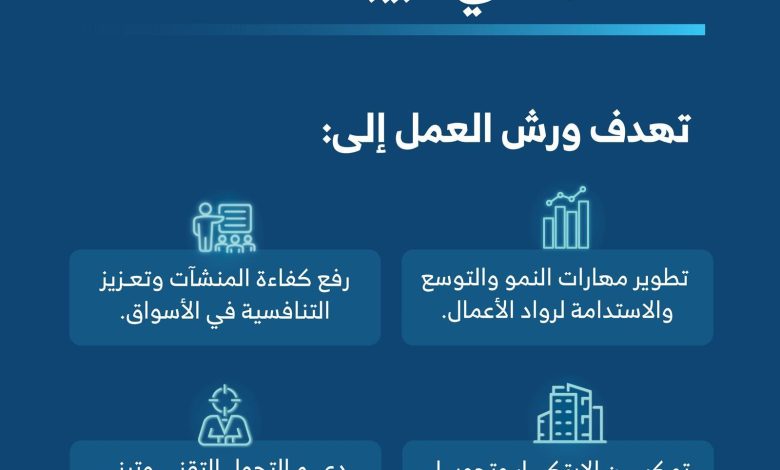 وتركّز الورش على رفع كفاءة المنشآت الصغيرة والمتوسطة، وتطوير مهارات رواد ورائدات الأعمال لتأسيس وتنمية مشاريعهم؛ بما يسهم في تعزيز قدراتهم التنافسية في السوقين المحلي والدولي، كما تسعى إلى تهيئة بيئة داعمة للابتكار، ومحفزة لأصحاب الأفكار الريادية على تحويلها لمشاريع ذات أثر اقتصادي مستدام.