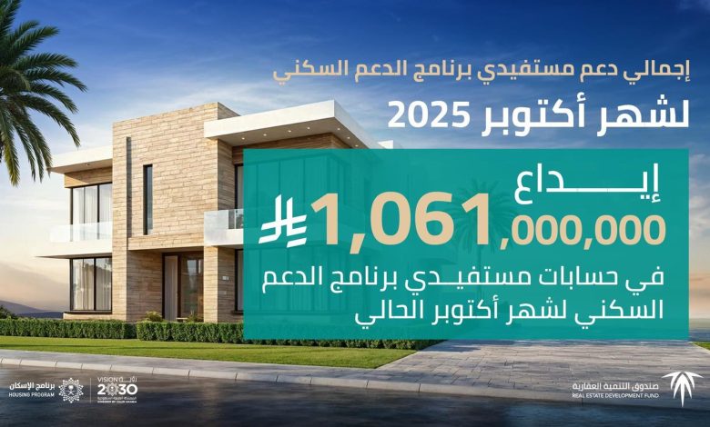 أعلن صندوق التنمية العقارية اليوم، إيداع مليارٍ وواحد وستين مليون ريال، في حسابات مستفيدي برنامج الدعم السكني من وزارة البلديات والإسكان، والصندوق العقاري، عن شهر أكتوبر 2025م.