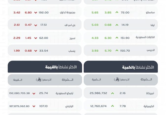 وكانت أسهم شركات المركز الكندي الطبي، وساسكو، وليفا، والكابلات السعودية، والدريس الأكثر ارتفاعًا، أما أسهم شركات المتحدة للتأمين، ومجموعة تداول، وبي إس إف، ونسيج، وينساب الأكثر انخفاضًا في التعاملات، وتراوحت نسب الارتفاع والانخفاض ما بين (5.91%) و(5.33%)، فيما كانت أسهم شركات أمريكانا، والكيميائية، ومهارة، وأرامكو السعودية، وزين السعودية، هي الأكثر نشاطًا بالكمية، بينما كانت أسهم أرامكو السعودية، والراجحي، وسابك للمغذيات الزراعية، والكيميائية، ونسيج، هي الأكثر نشاطًا في القيمة.