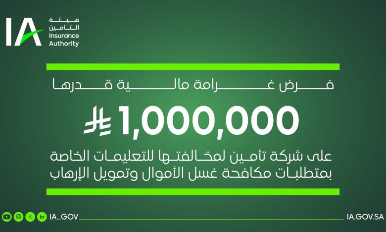 أعلنت هيئة التأمين عن فرض غرامة مالية بقيمة مليون ريال على إحدى شركات التأمين (لم تفصح عن اسمها)، بعد رصد عدد من المخالفات المتعلقة بمتطلبات مكافحة غسل الأموال وتمويل الإرهاب.