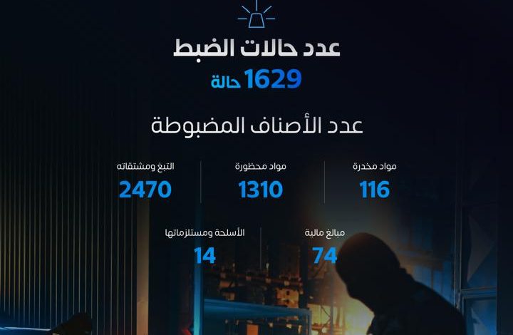 سجلت المنافذ الجمركية البرية والبحرية والجوية 1629 حالة ضبط للممنوعات، وذلك في إطار الجهود المستمرة التي تبذلها هيئة الزكاة والضريبة والجمارك “زاتكا” لتعزيز الجانب الأمني وحماية المجتمع من الممنوعات بمختلف أنواعها وأشكالها.