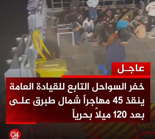 أنقد الأمن الليبي (45) مهاجرًا غير شرعي اليوم، كانوا على متن قارب مطاطي على بُعد (120) ميلًا بحريًا شمال طبرق.