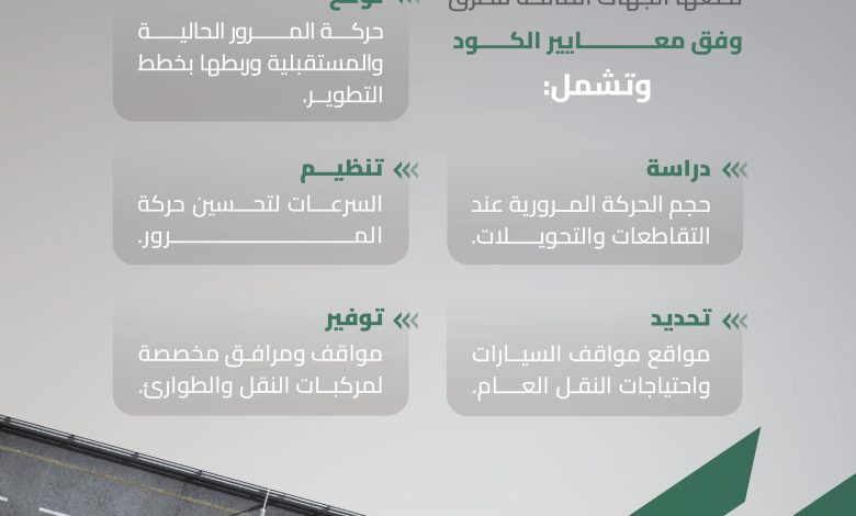 وبيّنت “هيئة الطرق” أن كود الطرق السعودي يوصي الجهات المالكة للطرق بإعداد هذه الخطط وفق معاييره، حيث تشمل دراسة حجم الحركة المرورية عند التقاطعات والتحويلات، وتحديد مواقع مواقف السيارات واحتياجات النقل العام، إلى جانب توقع الحركة المرورية الحالية والمستقبلية وربطها بخطط التطوير، وتنظيم السرعات لتحسين حركة المرور، وتوفير مواقف ومرافق مخصصة لمركبات النقل والطوارئ.