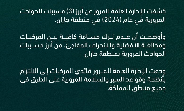 كشفت الإدارة العامة للمرور عن أبرز (3) مسببات للحوادث المرورية في عام (2024) في في منطقة جازان.