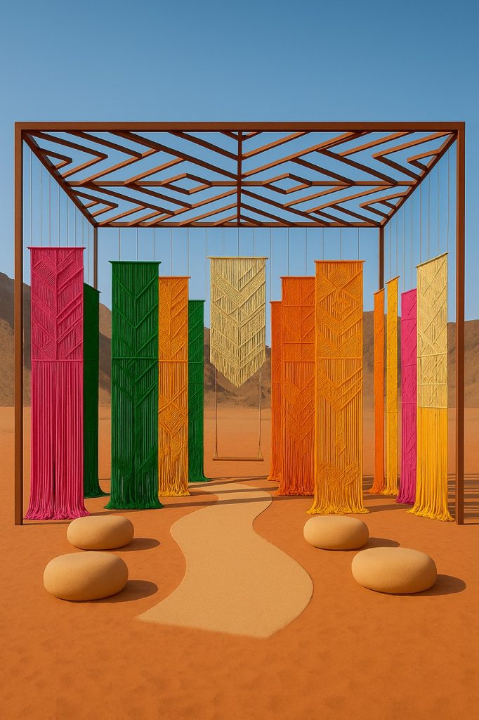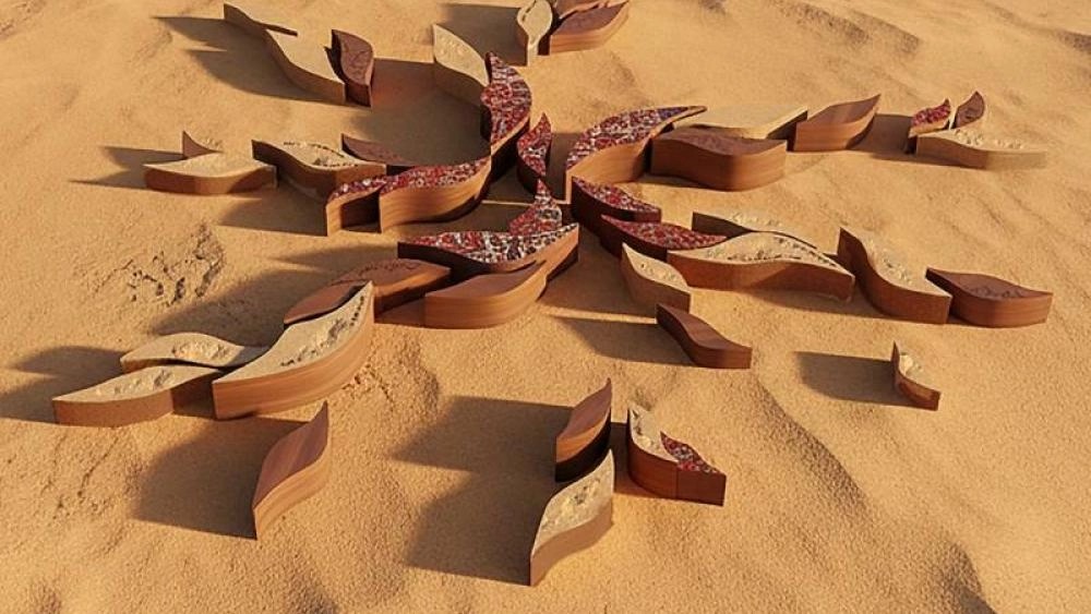 رنيم عروق، فنانة سورية ومصممة ومعمارية مقيمة في دولة الإمارات، معروفة باستكشافاتها الدقيقة للطبيعة والهندسة. في عملها “عُقَد الشعر: الجلوس مع الرومي“، تخلق رنيم تركيباً فنياً غامراً مستلهماً من بيت للشاعر جلال الدين الرومي: “كن كالشجرة ودَع الأوراق الميتة تسقط”. تبرز في العمل قطع خشبية تركيبية من الرمال كأوراقٍ متساقطة في مشهد طبيعي، بعضها متوج بسجاد، فيما نُقشت على أخرى أنماطٌ وزخارف وخطوط تجريدية، أو غُطيت بطبقات من الرمل. يستكشف العمل مفاهيم التحرر والتجدّد والتحوّل من خلال الشكل الشعري والمادة.