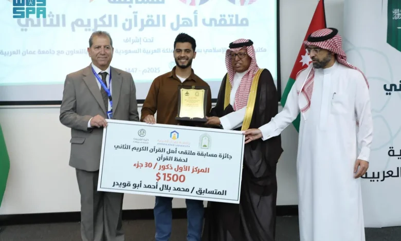 وخلال الحفل أكد نائب سفير خادم الحرمين الشريفين في عمّان محمد بن حسن مؤنس أن المسابقة تأتي امتدادًا لجهود المملكة العربية السعودية في خدمة القرآن الكريم والعناية بحفظته في مختلف أنحاء العالم؛ تنفيذًا لتوجيهات القيادة الرشيدة -أيدها الله- في نشر رسالة القرآن الكريم، وترسيخ قيم الوسطية والاعتدال، وتعزيز الروابط الأخوية بين الشعبين الشقيقين.