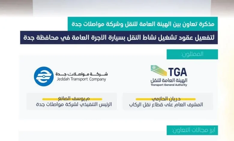 “هيئة النقل” توقّع مذكرة تعاون مع شركة مواصلات جدة لتفعيل عقود تشغيل نشاط النقل بسيارة الأجرة العامة
