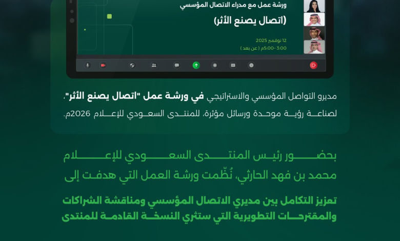 وبين الحارثي أن ورشة عمل “اتصال يصنع الأثر” تأتي ضمن اللقاءات التطويرية التي تعقد استعدادًا للنسخة الخامسة، بهدف بناء منصات أكثر تأثيرًا وتوسيع نطاق الشراكات الإعلامية، بما يعكس التطور المهني الذي يشهده قطاع الإعلام في المملكة وقدرته على مواكبة التحولات العالمية وصناعة خطاب مؤثر يعبّر عن رؤية المملكة الطموحة.