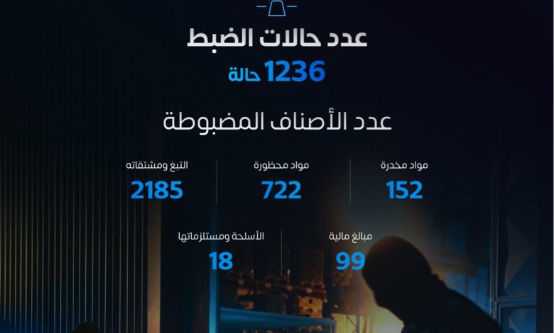 سجلت المنافذ الجمركية البرية والبحرية والجوية 1236 حالة ضبط للممنوعات، وذلك في إطار الجهود المستمرة التي تبذلها هيئة الزكاة والضريبة والجمارك “زاتكا” لتعزيز الجانب الأمني وحماية المجتمع من الممنوعات بمختلف أنواعها وأشكالها.