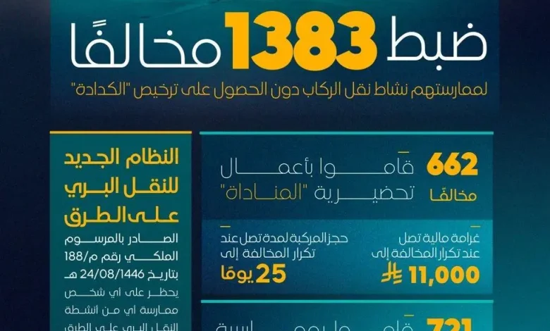 وأشارت الهيئة إلى أن النظام الجديد للنقل البري الجديد على الطرق، الصادر بالمرسوم الملكي رقم (م/188) وتاريخ (1446/08/24هـ)، شدد على منع ممارسة النقل دون ترخيص نظامي، ونصت العقوبات عند تكرار المخالفات على غرامات مالية تصل إلى (11) ألف ريال مع حجز المركبة لمدة (25) يومًا بحق من يقوم بالأعمال التحضيرية “المناداة”، فيما تصل العقوبات إلى غرامة قدرها (20) ألف ريال وحجز المركبة لمدة تصل إلى (60) يومًا بحق من يزاول النقل غير النظامي، مع إمكانية بيع المركبة المخالفة في مزاد علني وإبعاد غير السعودي في حال تكرار المخالفة.