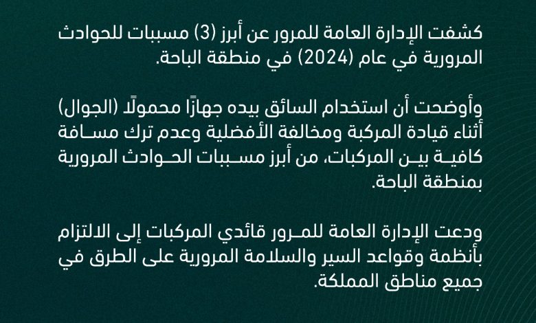 كشفت الإدارة العامة للمرور عن أبرز (3) مسببات للحوادث المرورية في عام (2024) في في منطقة الباحة.