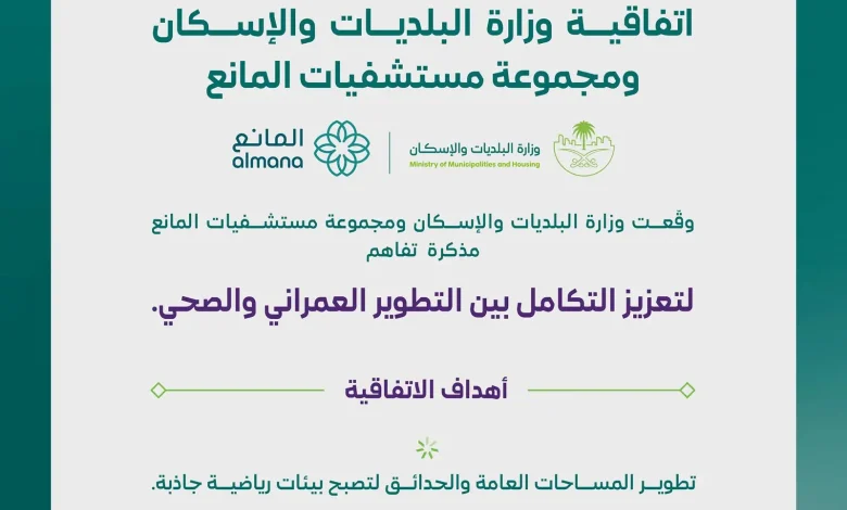 ونصت المذكرة على التعاون في تطوير المشاريع الصحية والخدمية ضمن منظومة التطوير العقاري، وإيجاد بيئات عمرانية متكاملة تضم مرافق طبية ومجتمعية تسهم في رفع جودة الخدمات الصحية في الأحياء والمدن الجديدة، إلى جانب تشجيع استثمارات القطاع الخاص في المشروعات البلدية التي تدعم الصحة العامة وجودة الحياة.
