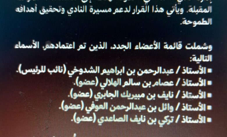 وأوضح النادي أن قائمة الأعضاء المنضمين لمجلس إدارته تضمنت كل من عبدالرحمن بن إبراهيم الشدوخي نائبًا للرئيس، وعصام بن سالم الهلالي، ونايف مبيريك الجابري، ووائل بن عبدالرحمن العوفي، وتركي بن نايف الصاعدي أعضاءً في مجلس إدارة النادي.