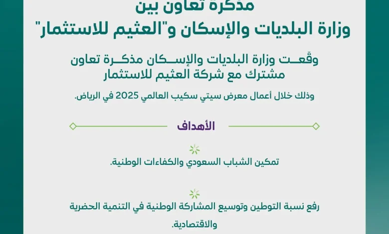 وتهدف المذكرة إلى تعزيز الشراكة بين وزارة البلديات والإسكان وشركة العثيم للاستثمار في مجالات تمكين الكفاءات الوطنية وتأهيل الشباب السعودي للعمل في القطاعات البلدية والعمرانية، بما يسهم في رفع نسبة التوطين وتوسيع مشاركة الكوادر الوطنية في التنمية الحضرية والاقتصادية.