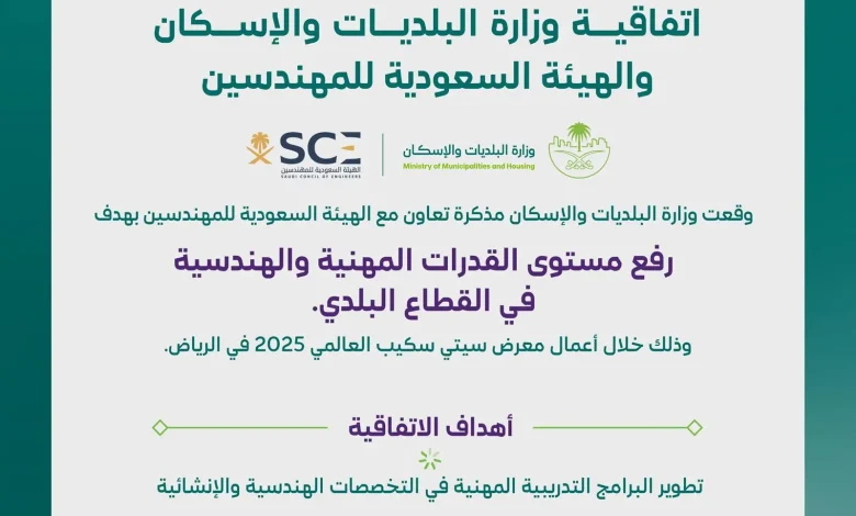 وتأتي هذه المذكرة في إطار جهود وزارة البلديات والإسكان لتوطين المهن الهندسية ورفع كفاءة الكوادر الوطنية في مختلف القطاعات العمرانية والبلدية، وتعزيز الشراكة المؤسسية مع الجهات المهنية الوطنية، بما يسهم في بناء قاعدة بشرية مؤهلة قادرة على دعم مسيرة التنمية وتحقيق مستهدفات رؤية المملكة 2030.