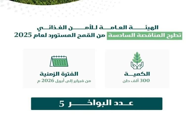 أعلنت الهيئة العامة للأمن الغذائي اليوم، طرح المناقصة السادسة والأخيرة لاستيراد القمح لهذا العام، وذلك لكمية (300) ألف طن للتوريد خلال الفترة (فبراير – أبريل 2026م).