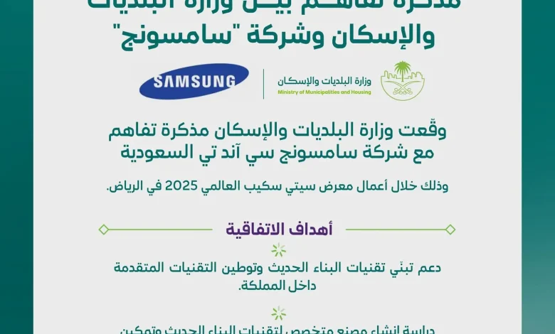 وقّعت وزارة البلديات والإسكان مذكرة تفاهم مع شركة سامسونج سي آند تي السعودية، ضمن فعاليات معرض “سيتي سكيب العالمي 2025” الذي تستضيفه مدينة الرياض خلال الفترة من 17 إلى 20 نوفمبر الجاري، بمشاركة محلية ودولية واسعة في قطاع التطوير العقاري والإنشاءات.