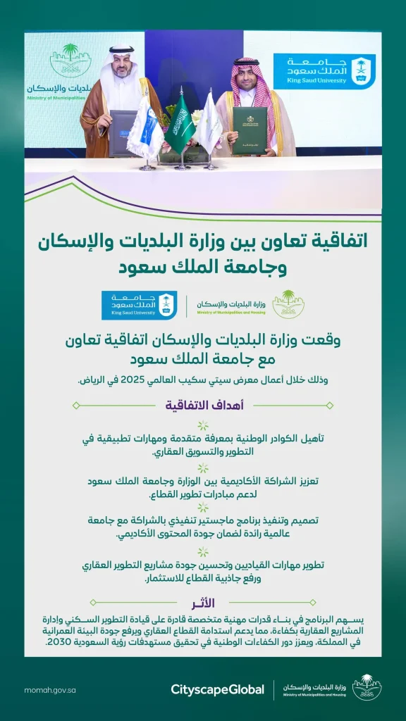 أبرمت وزارة البلديات والإسكان اتفاقًا مع جامعة الملك سعود لتنفيذ برنامج ماجستير تنفيذي متخصص في التطوير والتسويق العقاري، وذلك في إطار جهود تأهيل الكوادر الوطنية ورفع قدراتها المهنية في مجالات التطوير العقاري وإدارة المشاريع السكنية، بما يواكب متطلبات القطاع ويدعم مستهدفات رؤية المملكة 2030.