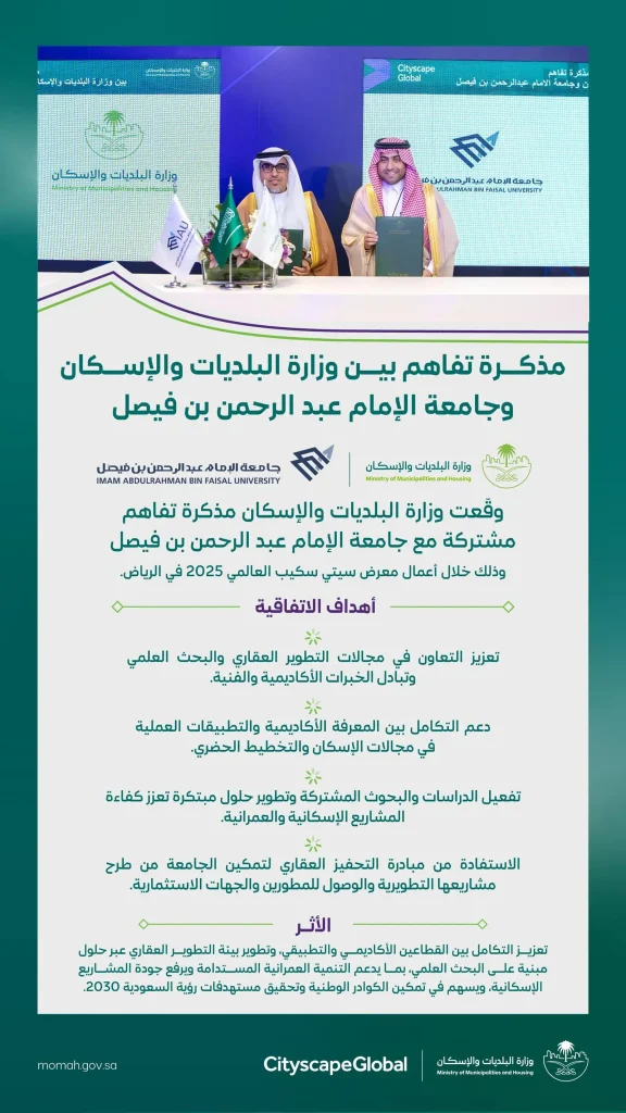 وقّعت وزارة البلديات والإسكان مذكرة تفاهم مشتركة مع جامعة الإمام عبدالرحمن بن فيصل، ضمن فعاليات معرض “سيتي سكيب العالمي 2025” الذي تستضيفه مدينة الرياض خلال الفترة من 17 إلى 20 نوفمبر الجاري، بمشاركة محلية ودولية واسعة في قطاع التطوير العقاري والإسكاني.