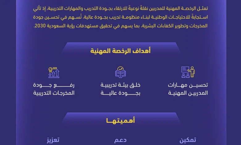 ويشترط للحصول على الرخصة اجتياز اختبار يعكس مستوى معرفة المدرب وكفاءته، ويُعد أداة لتحديد مجالات التطوير والاحتياج المهني، وتبرز أهميتها في دورها في تعزيز الثقة بين المدربين والمتدربين، وخدماتهم المقدمة إلى الأفراد والمؤسسات، وضمان مستوى مهني معتمد، وللمزيد من المعلومات عن الرخصة المهنية للمدربين زيارة الرابط: https://etec.gov.sa/ar/centers/nctea/p/p-47ac0fb1-b765-4310-8716-e2b560d9fd2f.