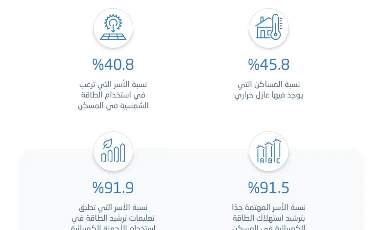 وفي جانب كفاءة الطاقة أظهرت النتائج أن 91.5% من الأسر تبدي اهتمامًا كبيرًا بترشيد استهلاك الكهرباء، و91.9% تطبق تعليمات الترشيد في استخدام الأجهزة الكهربائية، فيما أبدت 56.6% من الأسر استعدادها لاستبدال الأجهزة القديمة بأخرى أكثر كفاءة، وأظهرت 40.8% رغبتها في استخدام الطاقة الشمسية مصدرًا للطاقة في المسكن.