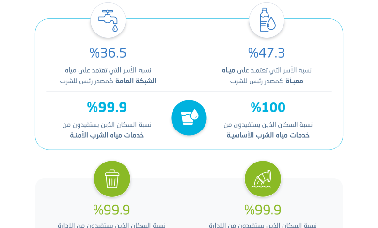 وأوضحت الإحصاءات أن 99.9% من الأسر تستفيد من خدمات الصرف الصحي الأساسية، بينما بلغت نسبة المستفيدين من خدمات الصرف الصحي الآمنة 89.5%، حيث سجلت المناطق الحضرية نسبة 93.7%، مقابل 59.3% في المناطق الريفية، وفي جانب إدارة النفايات أظهرت النتائج أن 99.9% من الأسر تستفيد من خدمات جمع النفايات الأساسية، فيما تتخلص 43.9% من الأسر من النفايات داخل المنازل بشكل يومي.