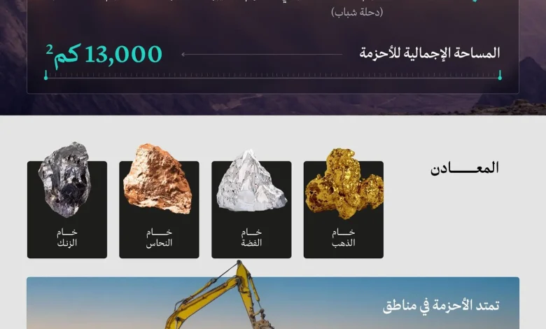وتشمل هذه الأحزمة التي تقع في خمس مناطق، هي: “المدينة المنورة، ومكة المكرمة، والرياض، والقصيم، وحائل”؛ مواقعَ استكشاف تعديني تُعد امتدادًا للمواقع المطروحة في المنافسة السابقة، من أبرزها حزام نبيطة/الدويحي “دحلة شباب” الذي يضم منجم الدويحي، بطاقة إنتاجية تبلغ نحو (180) ألف أوقية من الذهب سنويًّا، كما يشمل حزام صخيبرة/الصفراء، أحد أهم الأحزمة المتمعدنة الحاوية لخامات الذهب والنحاس والفضة والزنك والنيكل، الذي خضع لعددٍ كبير من الدراسات الاستكشافية على مدى العقود الماضية من قبل هيئة المساحة الجيولوجية السعودية.