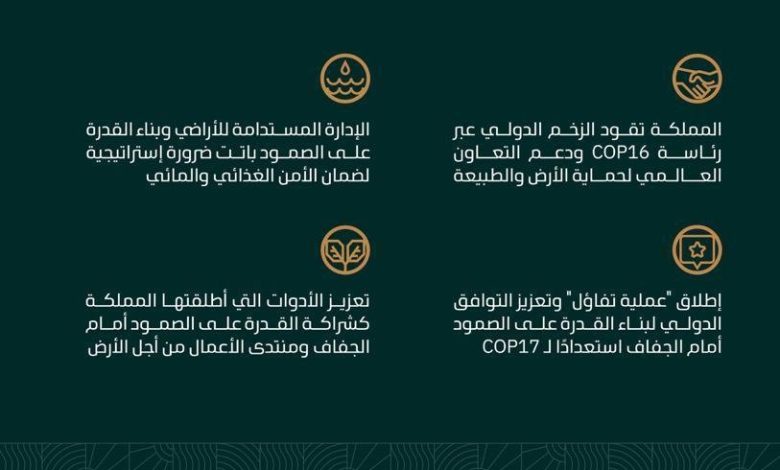وتواصل رئاسة الدورة السادسة عشرة لمؤتمر الأطراف لاتفاقية الأمم المتحدة لمكافحة التصحر (UNCCD COP16)، التي تتولاها المملكة قيادة الزخم العالمي لتعزيز التعاون الدولي في حماية الأرض والمناخ والطبيعة، مؤكدة أهمية التنفيذ الطموح لما تم الاتفاق عليه، وتسريع التحول نحو مستقبل أكثر قدرة على الصمود، وأكثر أمنًا غذائيًا، وأشد حفاظًا على الطبيعة.
