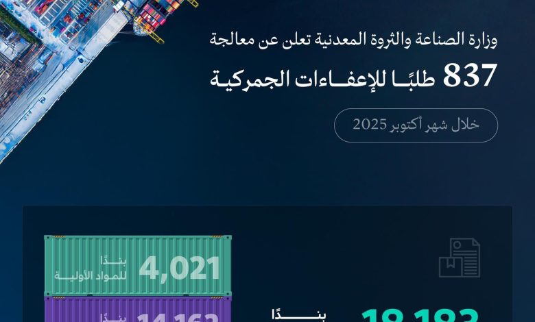 عالجت وزارة الصناعة والثروة المعدنية 837 طلبًا لخدمة الإعفاء الجمركي الصناعي خلال شهر أكتوبر 2025م، في إطار جهود الوزارة لتشجيع الصناعة المحلية وتعزيز تنافسيتها عالميًّا، عبر منح المنشآت الصناعية الوطنية إعفاءً من الرسوم الجمركية على وارداتها من مدخلات الصناعة.