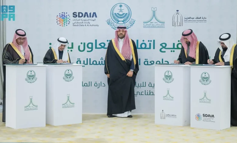 وعقب الاستقبال، شهد سموّه توقيعَ اتفاقيتين بين جامعة الحدود الشمالية ودارة الملك عبدالعزيز والهيئة السعودية للبيانات والذكاء الاصطناعي (سدايا).