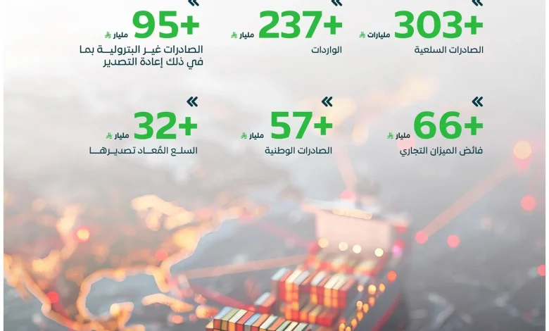 ومثّلت الصادرات السلعية ما نسبته (56.1%) من الإجمالي بقيمة (303.3) مليارات ريال، فيما شكّلت الواردات نسبة (43.9%) بقيمة (237.2) مليار ريال، ليُسجّل الميزان التجاري فائضًا قدره (66.1) مليار ريال.