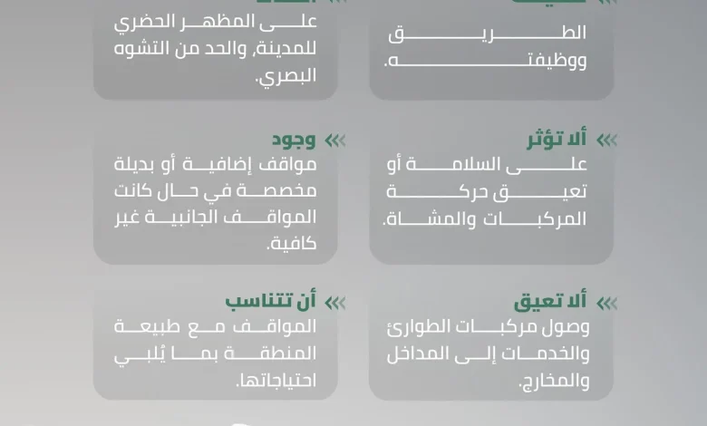 وبيّنت “هيئة الطرق” أن هذه الاشتراطات تشمل مراعاة تصنيف الطريق ووظيفته، والحفاظ على المظهر الحضري للمدينة، والحد من التشوه البصري, وضمان عدم تأثير المواقف على السلامة أو إعاقتها لحركة المركبات والمشاة, وعدم إعاقة وصول مركبات الطوارئ والخدمات إلى المداخل والمخارج، إضافة إلى توفير مواقف إضافية أو بديلة مخصصة في حال عدم كفايتها، وتكييف المواقف مع طبيعة المنطقة لتلبية احتياجاتها.