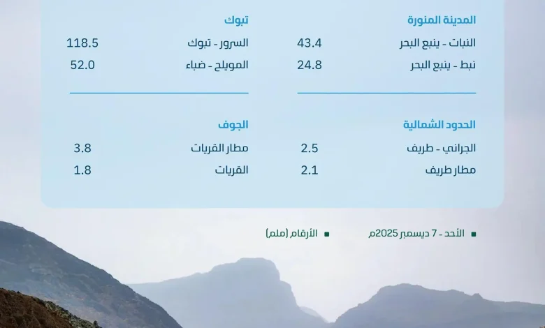 وأوضح التقرير أن منطقة المدينة المنورة سجلت (43,4) ملم في النباه- ينبع البحر، و(28.8) ملم في نبط – ينبع البحر، و(4.6) ملم في عشيرة – خيبر، و(4.0) ملم في ميناء ينبع، وسجلت منطقة الحدود الشمالية (2,5) ملم في محطة الجراني بطريف، و(2.1) ملم في مطار طريف، و(1.0) ملم في مركز حرس الحدود بطريف، وسجلت منطقة الجوف (3.8) ملم في مطار القريات، و(1,8) ملم في القريات، و(1.5) ملم في محطة رصد منوه بالقريات.