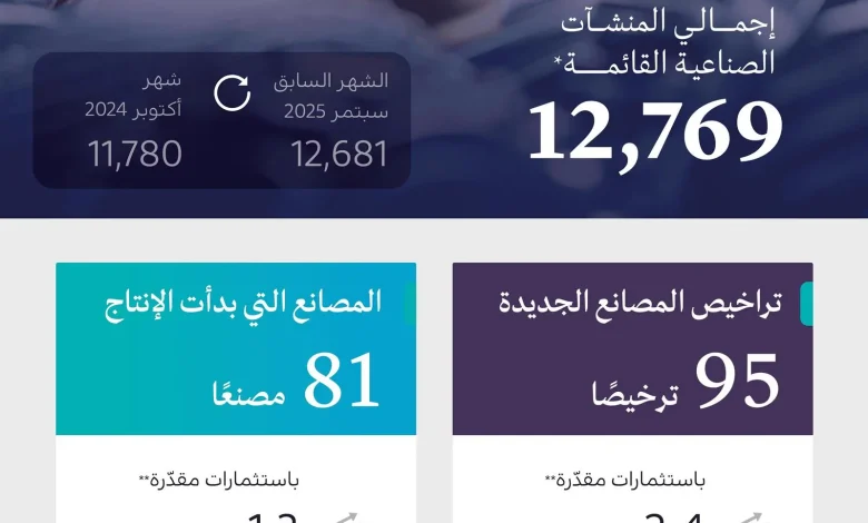 في المقابل، بلغت قيمة الاستثمارات في المصانع التي بدأت الإنتاج خلال أكتوبر (1.3) مليار ريال، مع فرص وظيفية تُقدَّر بـ(1,922) وظيفة جديدة، ما يعكس استمرار توسُّع القاعدة الصناعية في المملكة، وارتفاع وتيرة دخول المصانع إلى حيِّز التشغيل الفعلي.