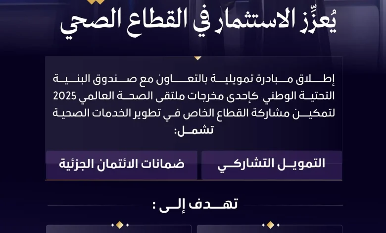 وأوضحت الوزارة أن المبادرة جاءت ضمن برنامج تمويل مشاريع التنمية التحتية الاجتماعية، حيث تتضمن إطلاق خدمات تمويلية مرنة لتمكين المستثمرين من تطوير مشاريعهم الصحية عبر حلول عدة، ومنها: التمويل التشاركي وضمانات الائتمان الجزئية.